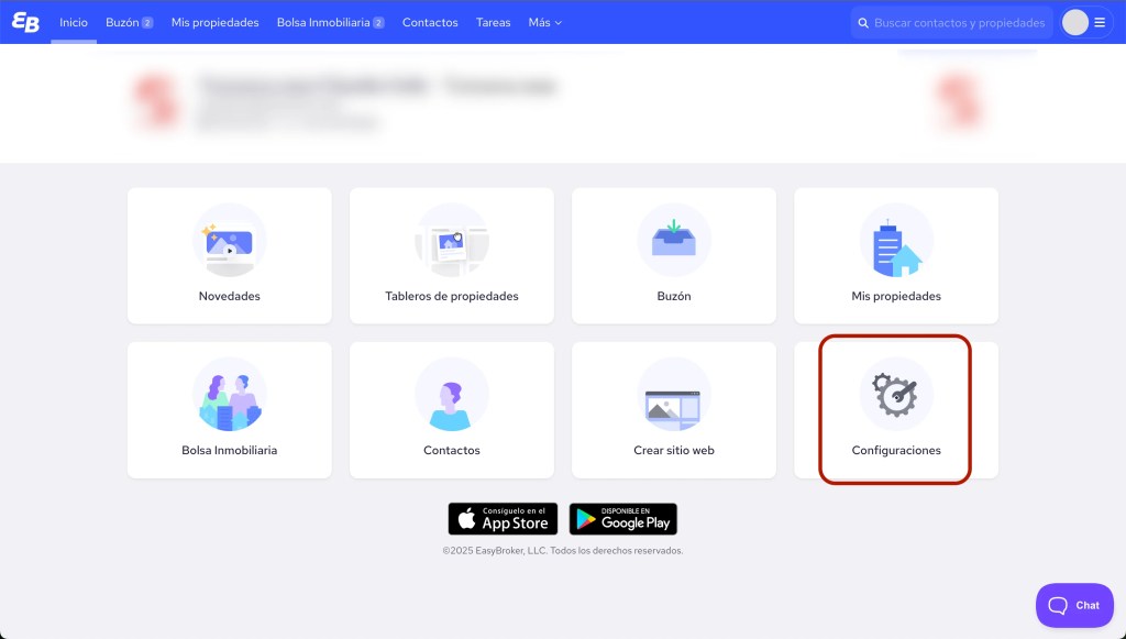 Al entrar a tu cuenta de EasyBroker te va a salir algo más o menos como se ve a continuación. Dale click a donde dice “Configuraciones”.