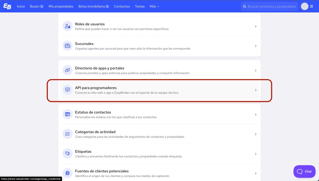 Después baja por la pantalla hasta que encuentres la siguiente opción. Dale click a donde dice “API para programadores”.