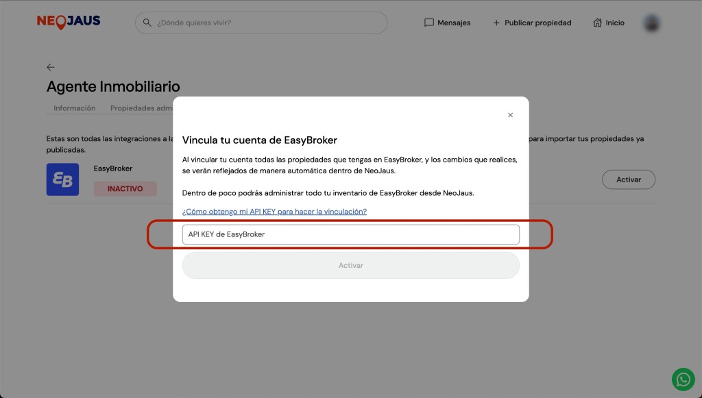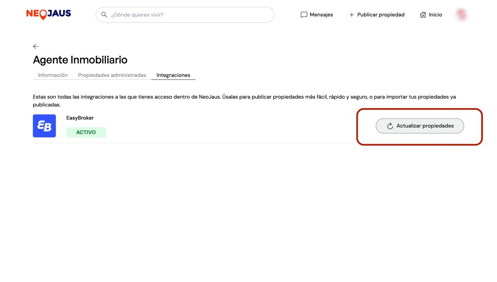 Dale click en “Activar” y después en “Actualizar propiedades” para descargar todo tu inventario activo de EasyBroker a NeoJaus. ¡Y listo! Nosotros nos encargaremos del resto: de buscar las imágenes, actualizar la información, bajar solo las propiedades activas, etc.